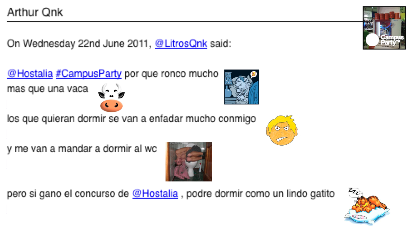 Arturo Pérez Romero (@LitrosQnk) es el primer ganador del concurso de Hostalia. Este campusero disfrutará de una noche de alojamiento gratuito en la furgo de Hostalia durante la Campus Party 2011. ¡Enhorabuena! Aquí puedes ver el tuit que nos envió :)