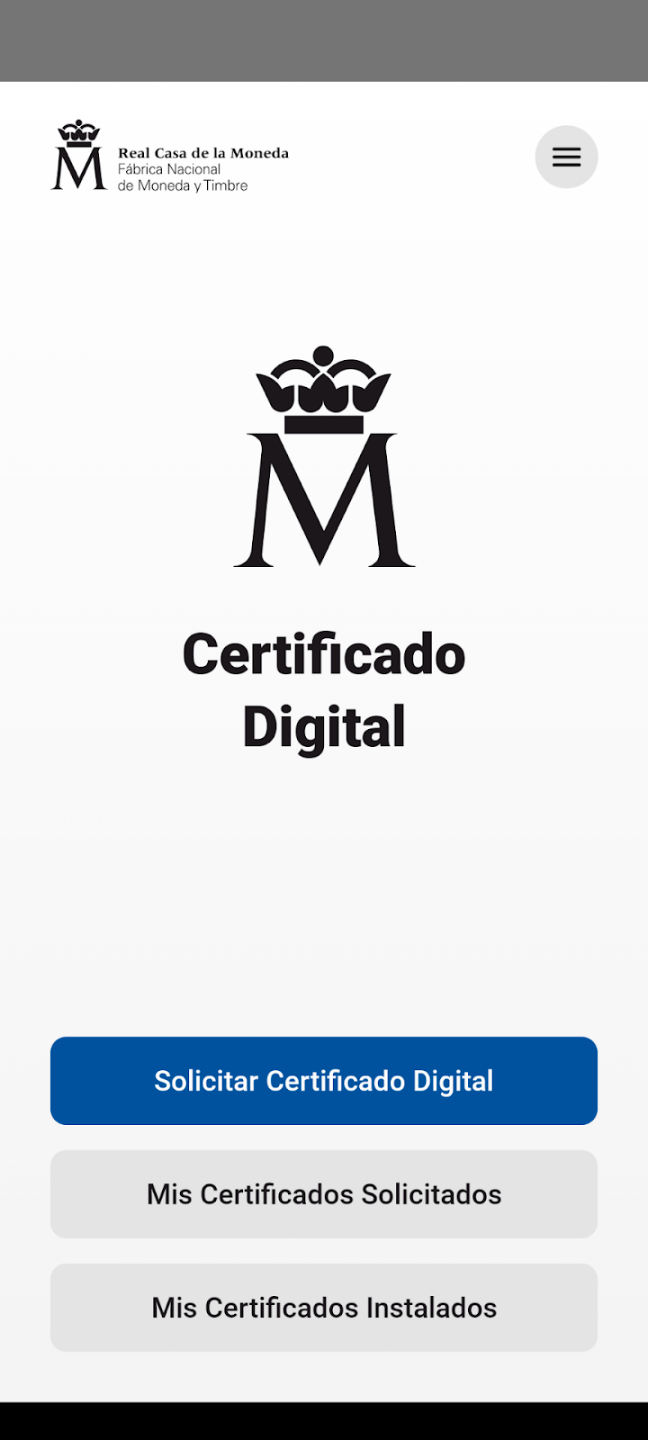 La opción más rápida para la mayoría de usuarios es la aplicación oficial Certificado Digital FNMT, disponible tanto en Google Play (Android) como en la App Store (iPhone). Una vez descargada e iniciada la sesión, el botón de acción principal (visible en la parte superior de la pantalla en color azul) te llevará directamente al proceso de solicitud.
